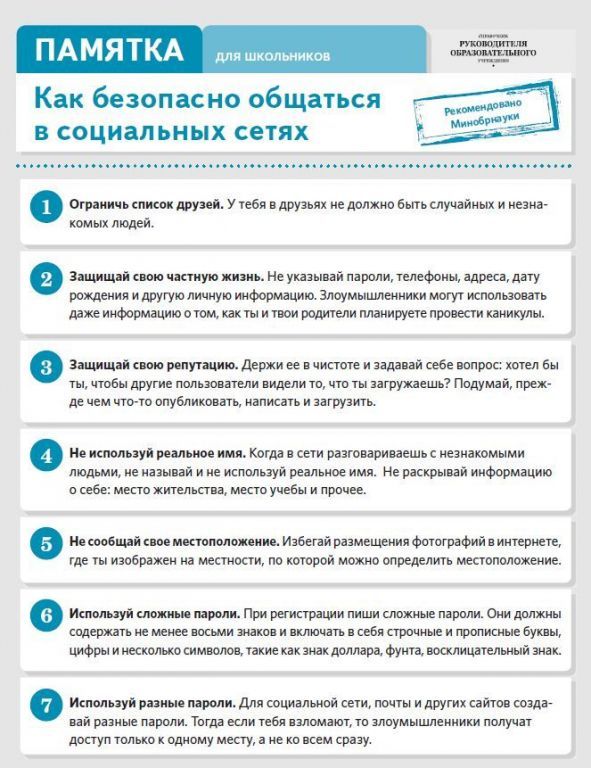 - При регистрации в социальной сети необходимо использовать сложные пароли, состоящие из букв и цифр и с количеством знаков не менее 8;