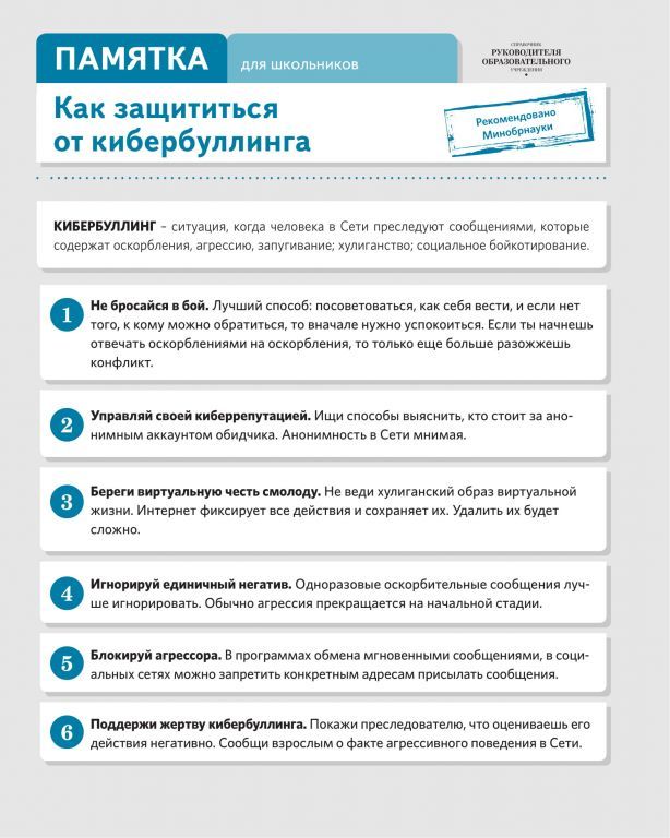 - Если ты свидетель кибербуллинга. Твои действия: выступить против преследователя, показать ему, что его действия оцениваются негативно, поддержать жертву, которой нужна психологическая помощь, сообщить взрослым о факте агрессивного поведения в сети.